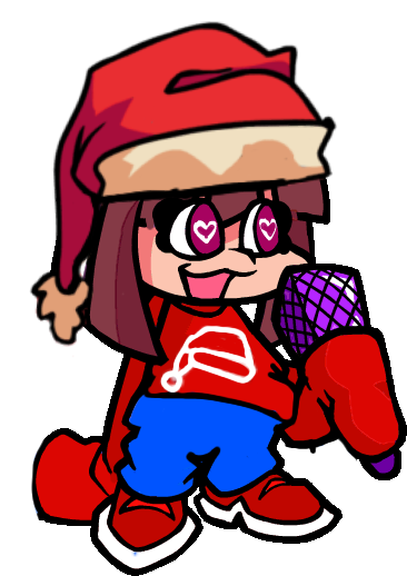 Яркое изображение стилизованного игрового персонажа в праздничном новогоднем колпаке и свитере с тематическим принтом. Персонаж держит микрофон, его глаза выполнены в форме сердец, что придает образу особую привлекательность. Идеально подходит для фанатов и коллекционеров игровой атрибутики.