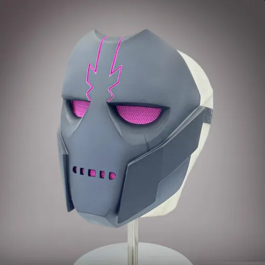 Футуристическая маска в стиле кибер-воина, идеально подходящая для косплея, тематических вечеринок или в качестве уникального элемента декора. Выполнена в сером цвете с эффектными розовыми элементами, имитирующими молнии и технологические акценты. Сетчатые вставки на глазах и вентиляционные отверстия на уровне рта добавляют реалистичности и комфорта.
